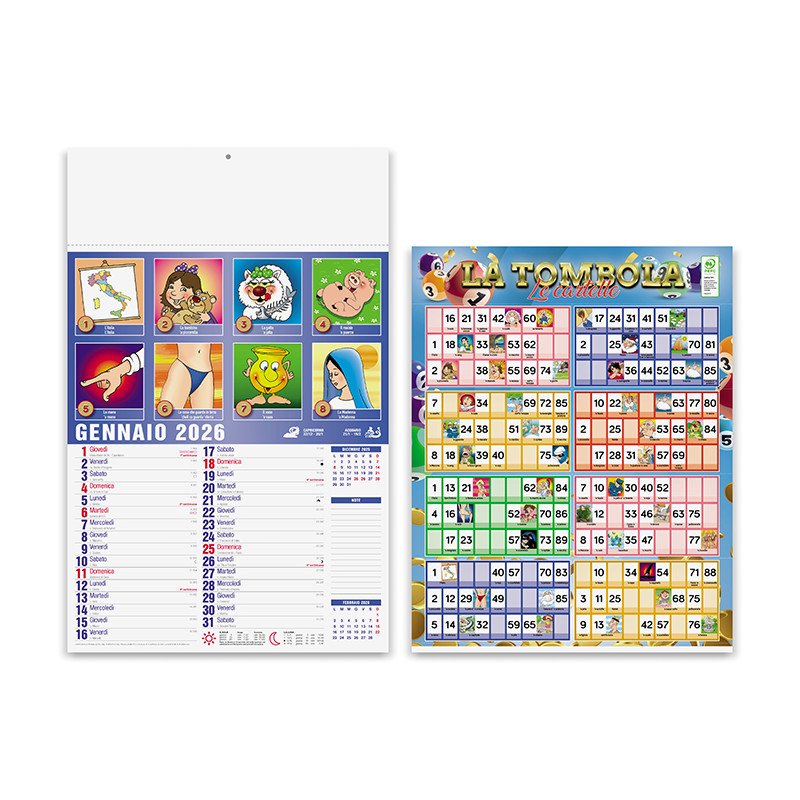 Calendari PA114 CABALA personalizzati di dimensioni complessive 30 cm. x 47 cm. composti da 12 fogli su carta patinata opaca da gr. 70 e da testata di dimensioni 30cm x 9 cm.